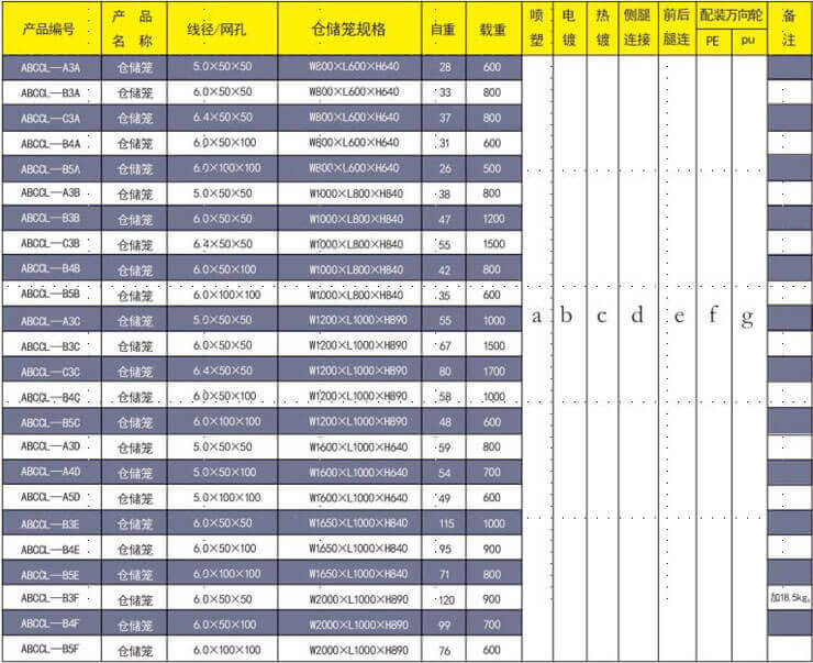標(biāo)準(zhǔn)ABCCL—B3A型型: ABCCL—(安貝倉(cāng)儲(chǔ)籠) A1A代表線徑5mm,B代表代表線徑6mm,C代表代表線徑6.4mm。 A1A(為網(wǎng)孔25*25mm),2(為網(wǎng)孔25*50mm),3(為網(wǎng)孔50*50mm)4(為網(wǎng)孔50*100mm) 5(為網(wǎng)孔100*100mm)。 A1A代表籠子規(guī)格L800*W600*H640,B代表表籠子規(guī)格L1000*W800*H840,C代表表籠子規(guī)格L1200*W1000*H890